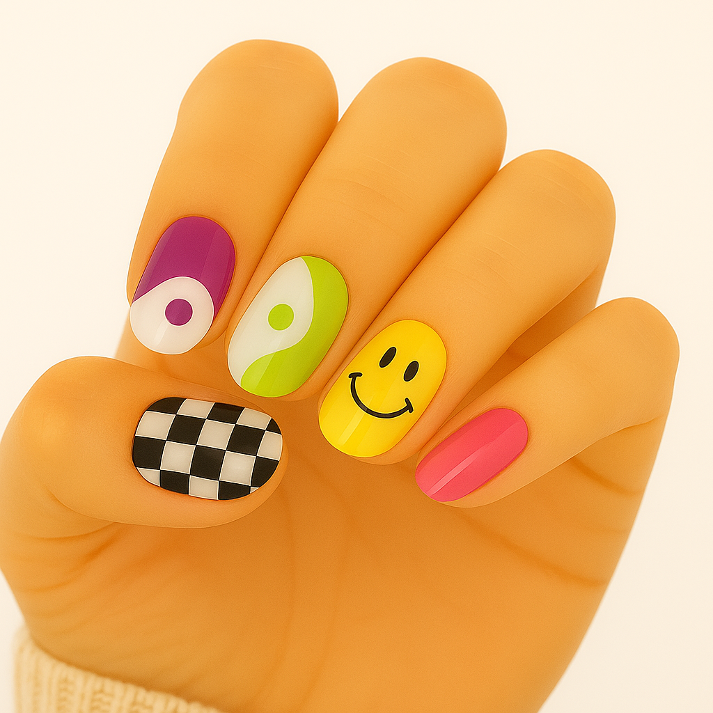 A bold mashup of playful chaos and good vibes. From smiley faces and checkerboards to yin-yang swirls in vibrant tones, this design brings together your fun, funky, and unpredictable side—all in one seriously aesthetic set. Wear it when you feel like being everything, everywhere, all at once.