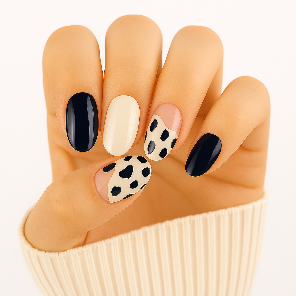 A bold mix of creamy elegance and inky depth, Dalmatian Dusk pairs soft nude and ivory tones with deep navy blue and abstract spotted accents. Inspired by twilight city strolls and playful prints, this design blends chic minimalism with modern flair.