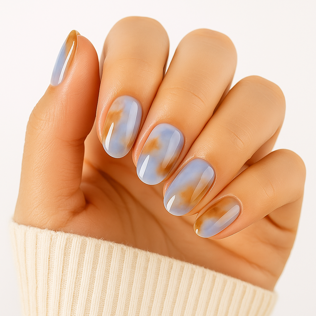 A soft swirl of misty blue and warm amber, Marbled Skies captures the beauty of a painted sky at golden hour. This dreamy, stone-inspired design blends earthy tones with fluid movement, giving your nails an airy, elegant finish that’s equal parts calm and captivating.