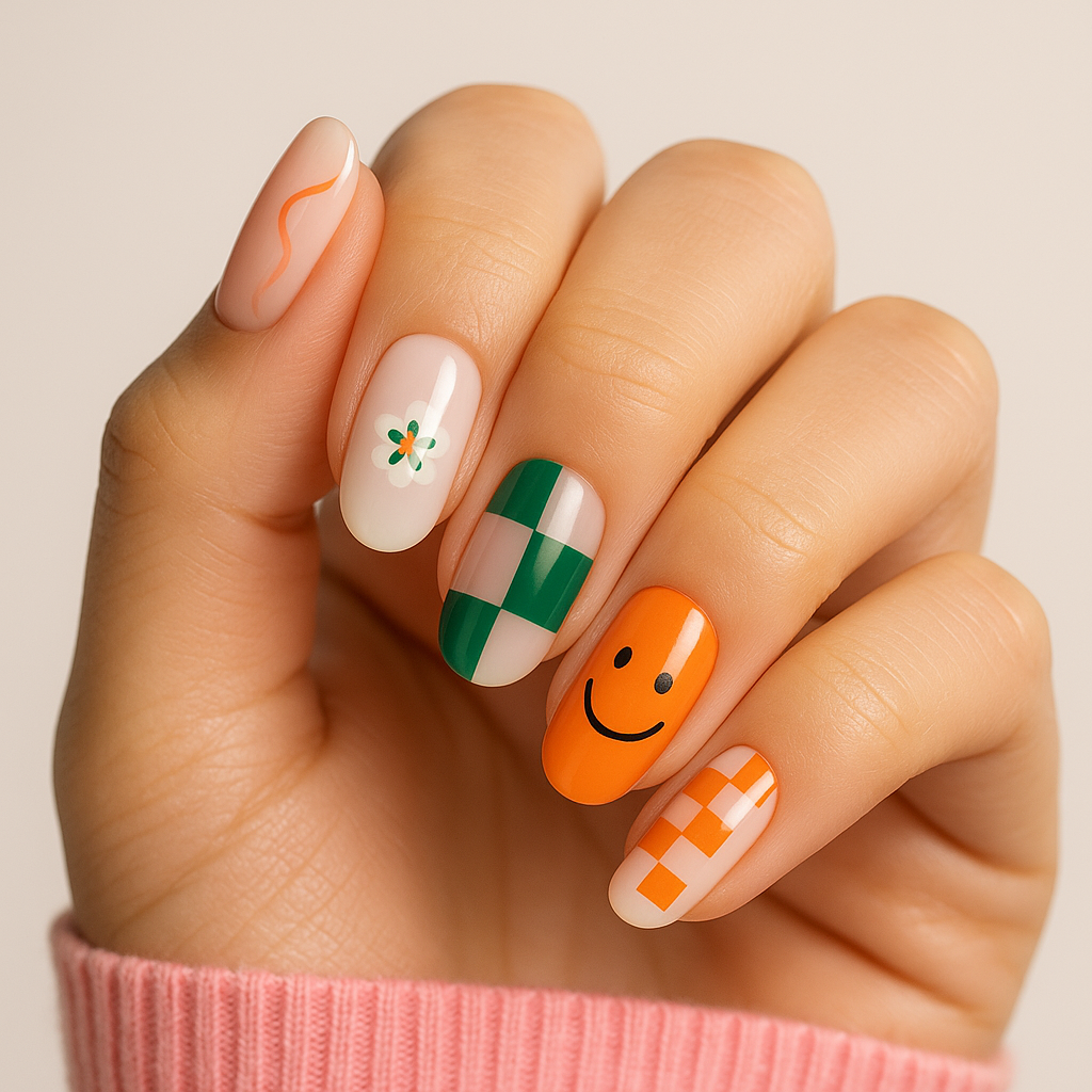 Step into a sunshine state of mind with Happy Daze — a playful blend of retro charm and carefree spirit. This vibrant set features a cheerful mix of orange and teal checkerboard patterns, quirky swirls, blooming florals, and a bold smiley face that radiates good vibes. Set against a translucent base with pops of pastel pinks and purples, these designs evoke a nostalgic ‘70s-meets-Y2K’ energy that’s both fun and free-spirited. Perfect for those who love to wear joy at their fingertips.