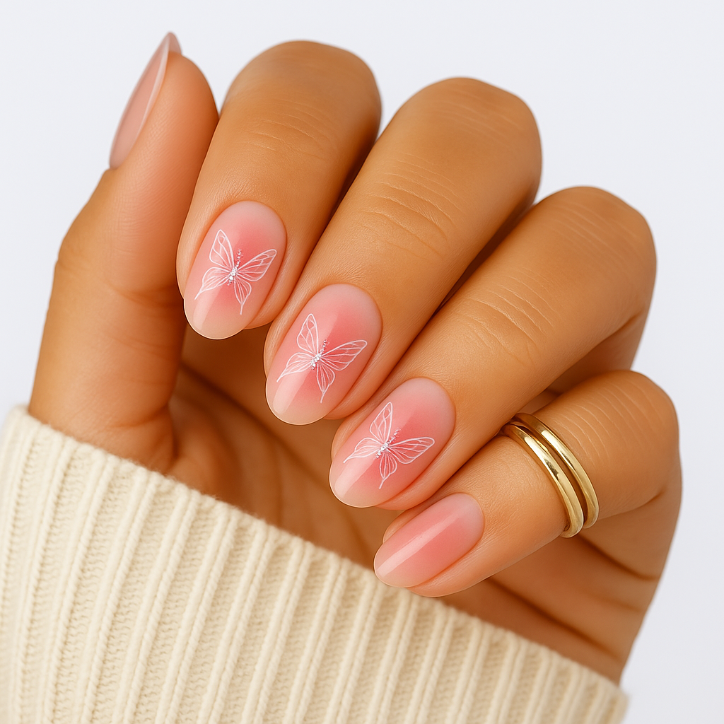 A delicate ombré of blush and nude, kissed with airy white butterfly details that feel light as a whisper. Butterfly Kisses brings a soft, romantic charm to your fingertips—perfect for those who love elegance with a touch of whimsy.